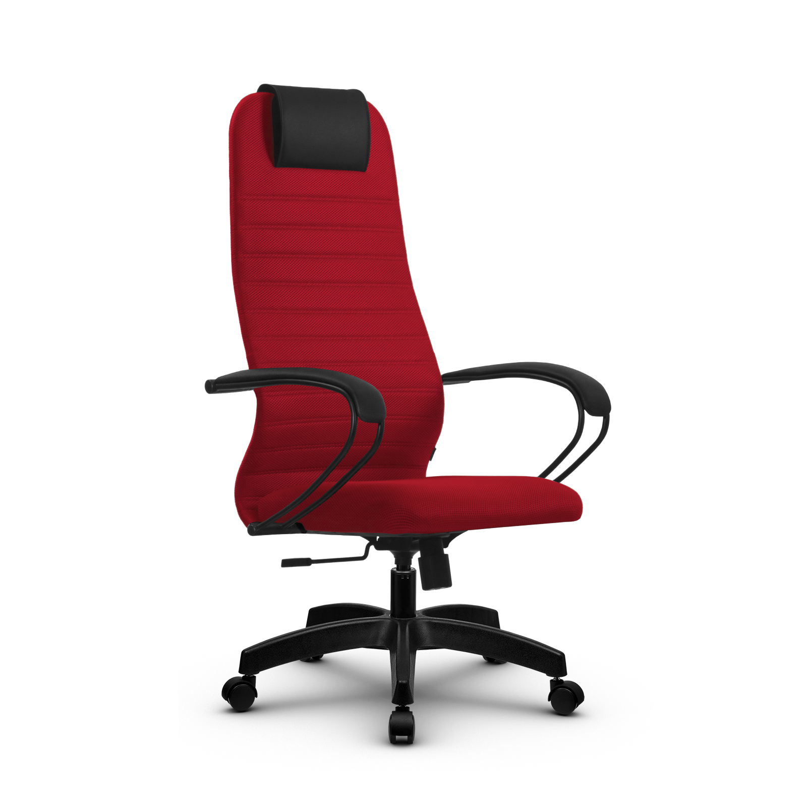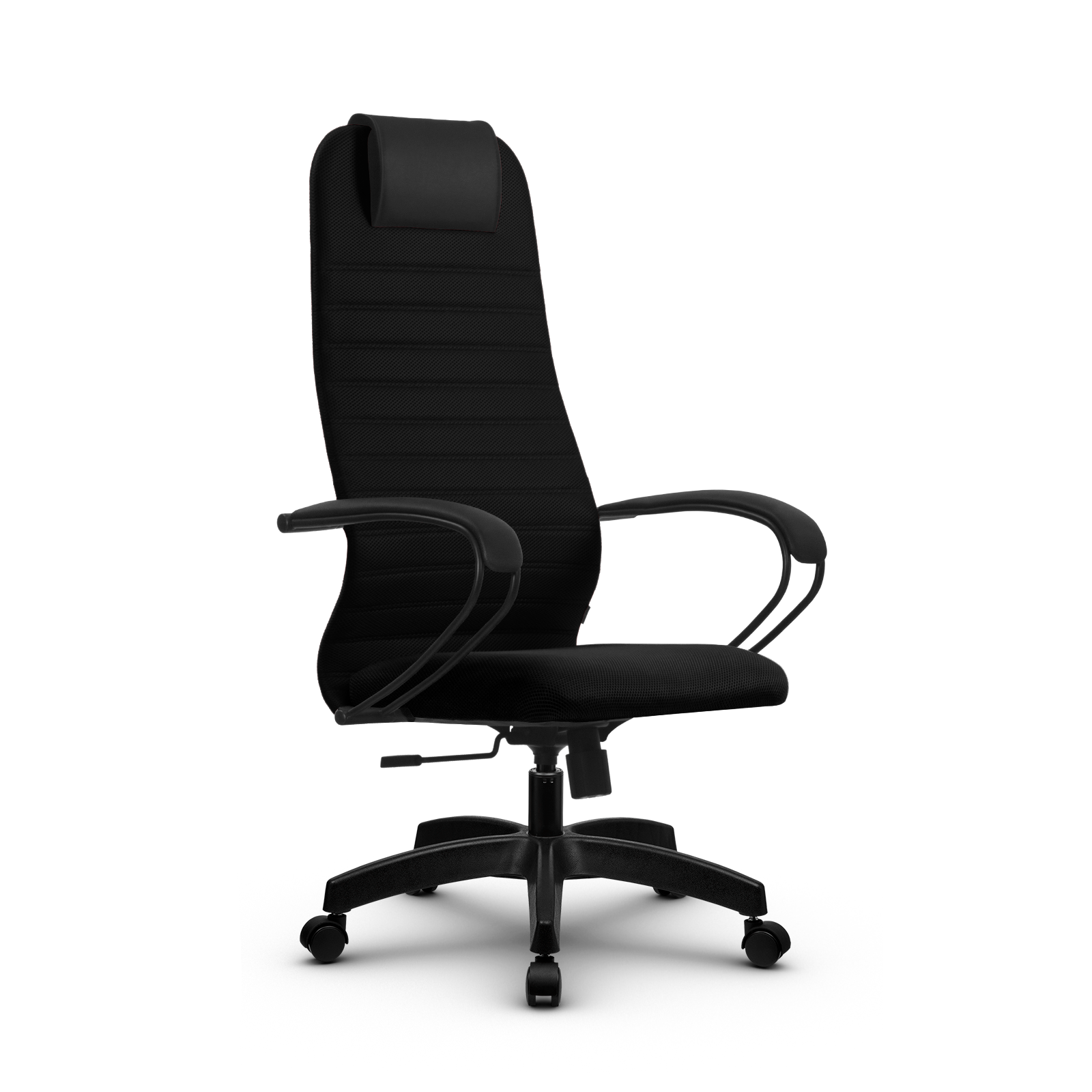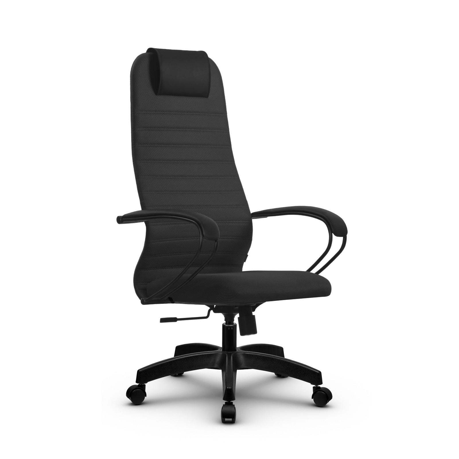 Спинка: высокая с мягким подголовником, черное полимерное покрытие каркаса, высота 860 мм, ширина 475 мм
