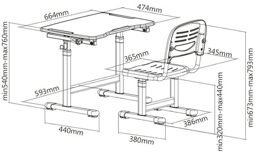 Размеры (ШхГхВ): Стол 664x474x540-760 мм / Стул 390X418X653-793 мм